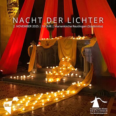Am 02. November 2025 um 18:00 Uhr ist es soweit: Die Nacht der Lichter findet in der Reutlinger Marienkirche statt. Viele Kerzen, wunderbare Musik, Zeit zum einstimmen in die besinnliche Jahreszeit und eine einmalige Atmosphäre warten auf Euch!